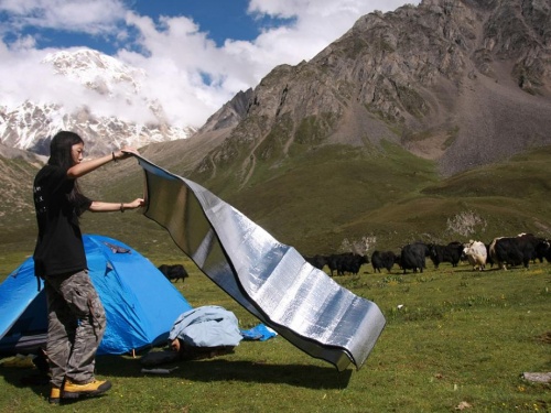 | + | [[File:0 IMG 2660.JPG|thumb|500px|徒步就住在这样的帐篷,睡这样的床。远处是雪山,周围是成群的牦牛。 | ||